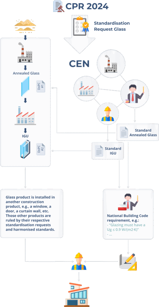 The standardisation request for glass in building (Sreq GLA) is currently planned to be published by the European Commission in 2026 as an Implementing Act under the CPR 2024.